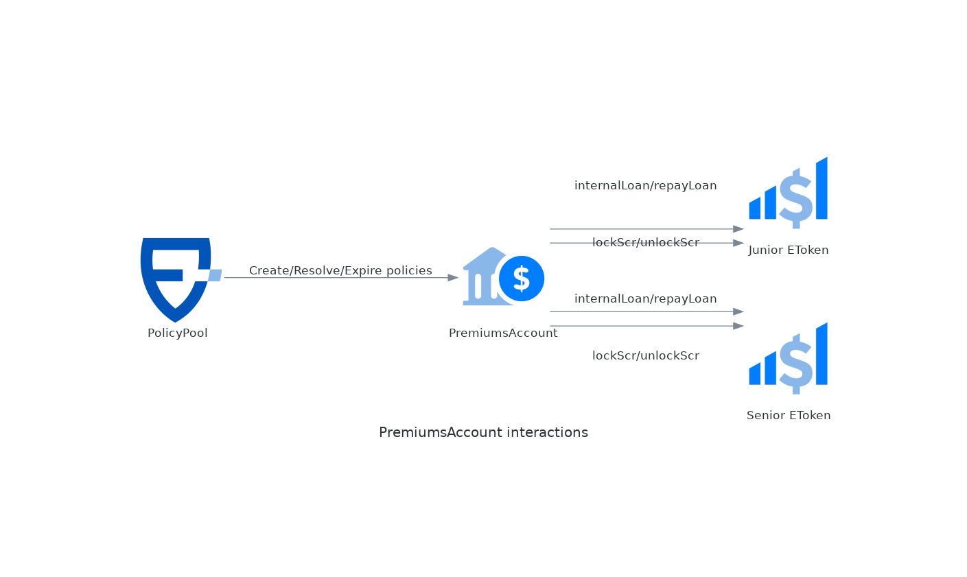The risk modules are grouped in *premiums accounts* that keep track of the pure premiums (active and earned) their policies. The responsibility of these contracts is to keep track of the premiums and release the payouts. When premiums are exhausted (losses more than expected), they borrow money from the *eTokens* to cover the payouts. This money will be repaid when/if later the premiums account has a surplus (losses less than expected).